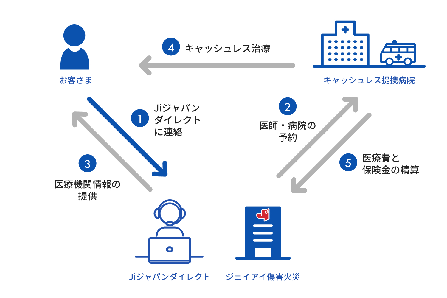 旅行中のケガや病気の治療費をジェイアイ傷害火災保険から提携病院に直接支払うため、お客様が治療費をご負担することなく治療を受けられます。